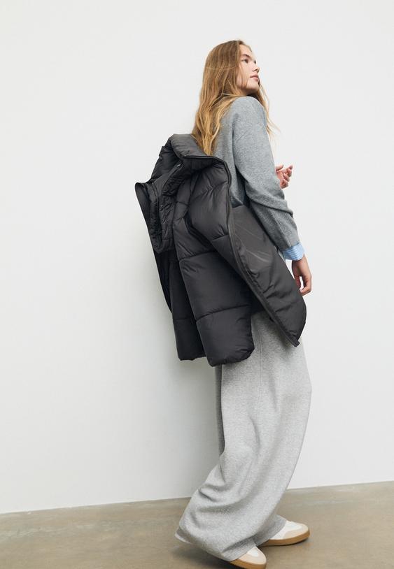 Oversize Steppjacke mit Stehkragen, Kapuze und langen Ärmeln. Vordertaschen. Verstellbarer Saum mit Kordelzug und Stoppern. Reißverschluss und verdeckte Druckknöpfe vorne in der Patte. In verschiedenen Farben erhältlich.