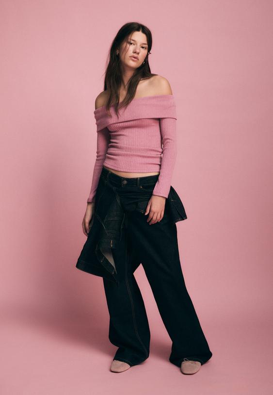 Strick-T-Shirt mit Carré-Ausschnitt und langen Ärmeln mit schulterfreiem Schnitt. Seitlich geraffter Stoff. In verschiedenen Farben erhältlich.