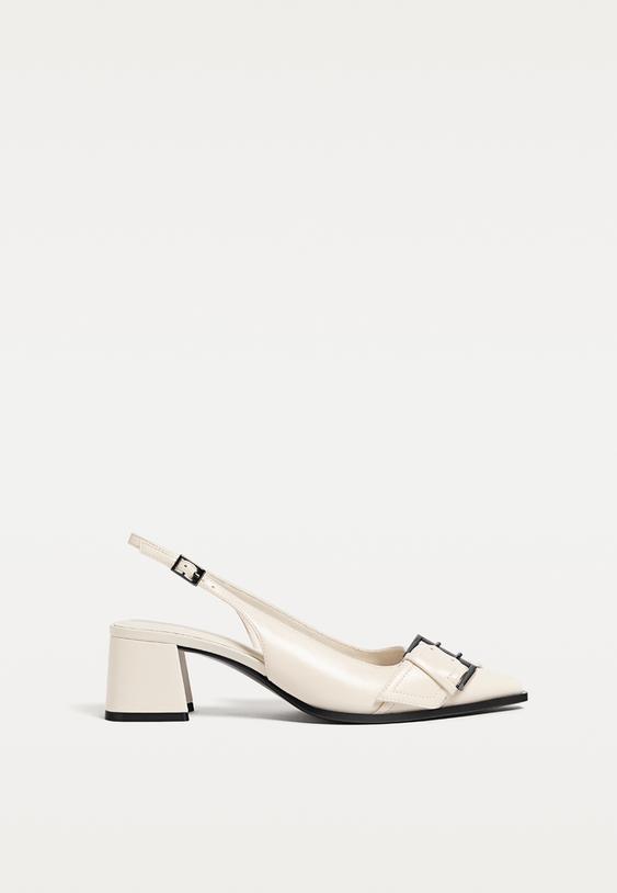 Hinten offene Ballerinas mit Absatz. Schnallendetail im Zehenbereich. Knöchelriemen mit Schnallenverschluss. In verschiedenen Farben erhältlich. Absatzhöhe: 5 cm.