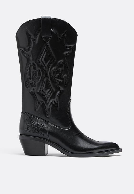 Las Botas Cowboy Negras de Tacón son una pieza clave para crear looks diarios con personalidad. Combínalas con jeans rectos o ajustados, una camiseta y una cazadora o blazer para un conjunto cómodo y a la moda. Para un giro más pulido, usa una falda midi o un vestido de punto y una chaqueta estructurada; el tacón eleva el conjunto sin perder comodidad. Si buscas un toque más bohemio, añade un suéter de punto grueso, una bufanda y un bolso de piel; la combinación de texturas cuero-punto crea un look equilibrado y sofisticado. Estas botas también funcionan muy bien con faldas plisadas o pantalones palazzo si buscas un contraste entre lo ancho y lo ajustado. En Stradivarius España, encontrarás distintos acabados y tallas para adaptarse a cada pie y estilo, con opciones de cuero genuino o piel sintética y tallas que facilitan un ajuste cómodo para todo el día.
