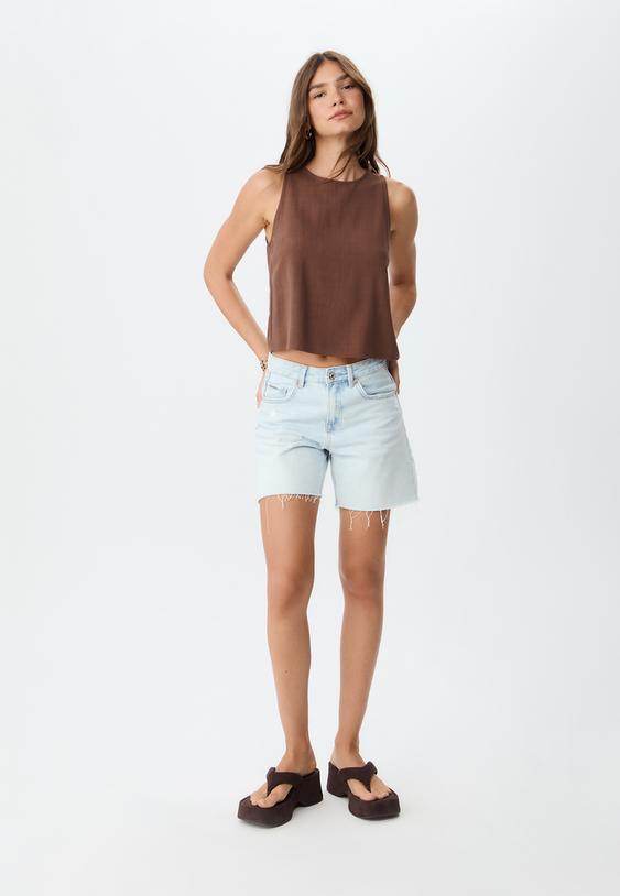 - Top corto de color marrón: perfecto para looks veraniegos cuando se combina con pantalones de tiro alto o faldas fluidas.