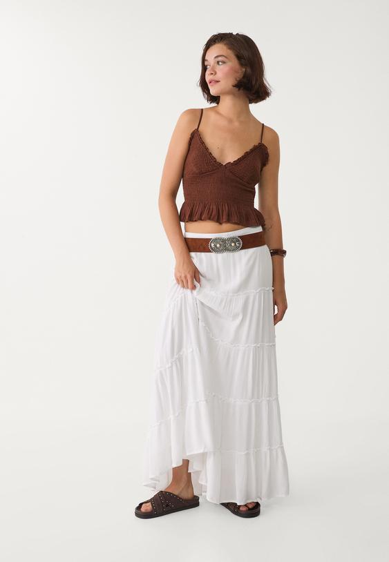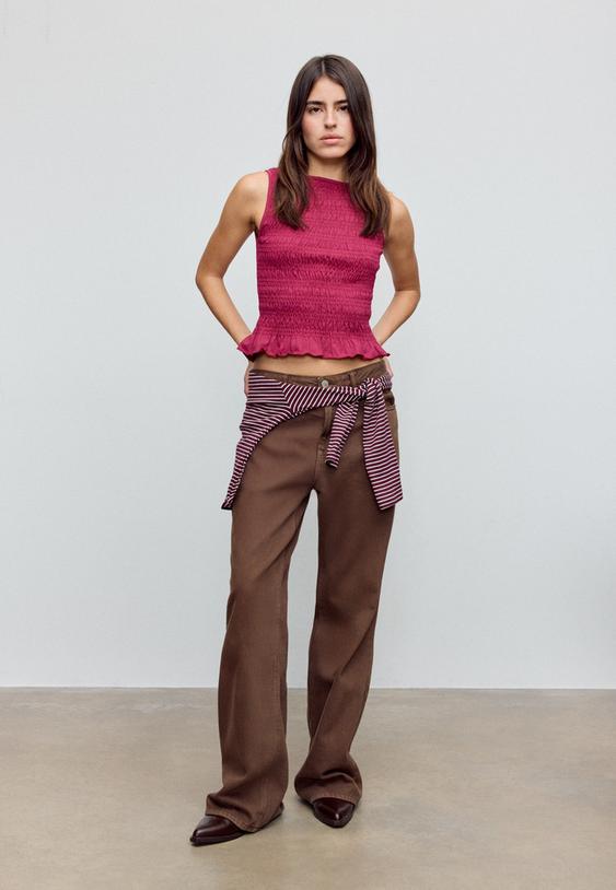 - Tops cortos de algodón con volante: perfectos para combinar con faldas altas o pantalones de tiro alto.