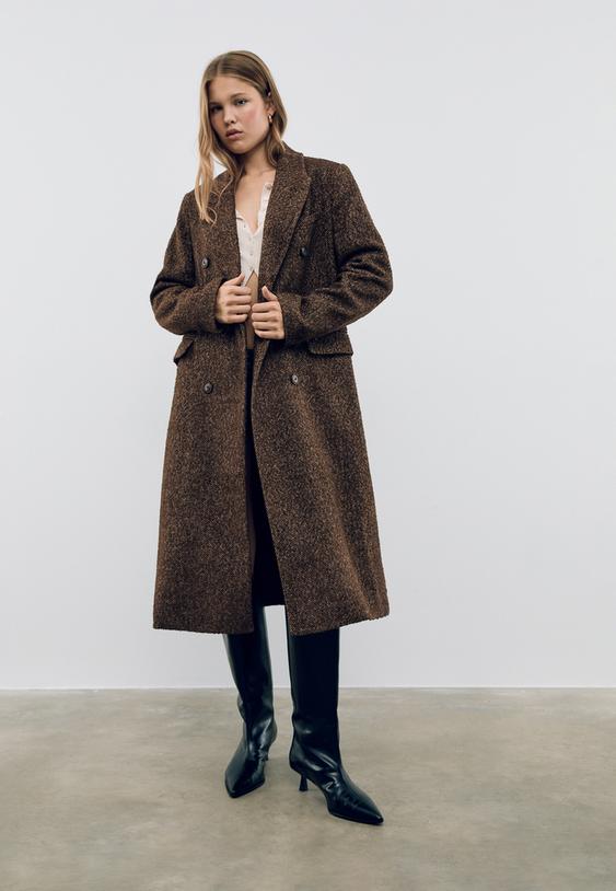 Oversize soft-touch coat with a lapel collar and long sleeves. False front pockets. Double-breasted fastening with contrast buttons.