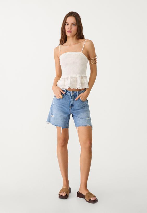 Fitted stretch top with a straight neckline and adjustable thin straps. Ruffles. Loose-fitting hem. Available in assorted colours.
