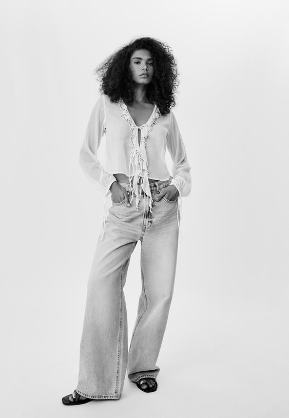 Blouse made of loose-fitting semi-sheer fabric. Featuring a V-neckline, long sleeves with tied cuffs, ruffles with embroidered beads and tied drawstring fastening at the front.