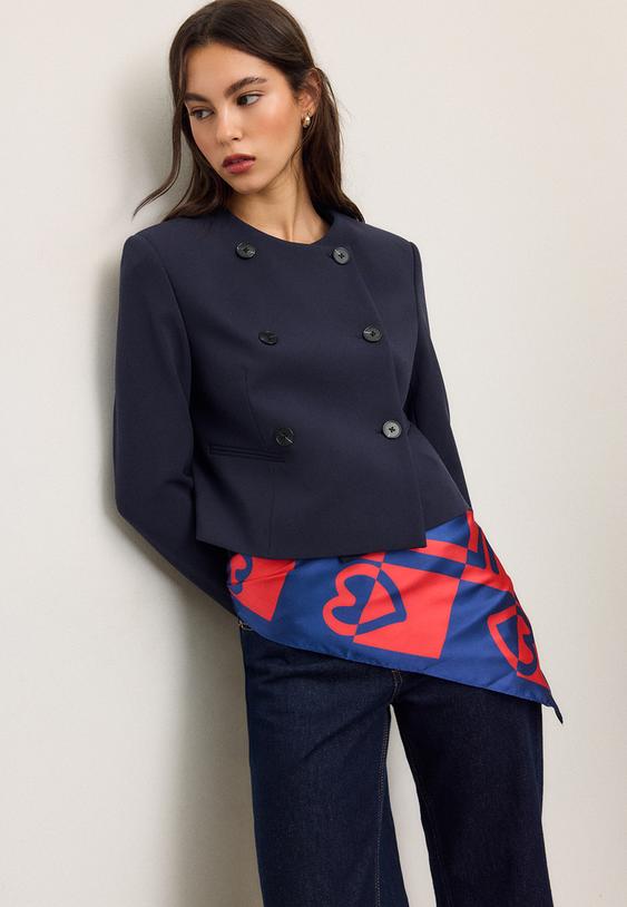 Round neck, long sleeve cropped blazer. Featuring false welt pockets on the front. Double-breasted button fastening at the front. Available in several colours.