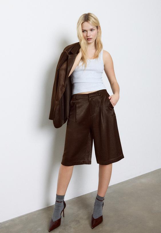 Stradivarius Satin Bermuda Shorts With Darts Brown 12