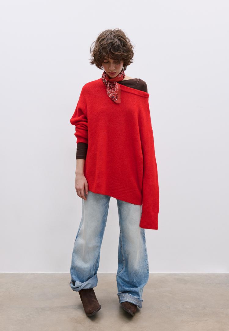+ Kleurensweater met boothals en open schouder