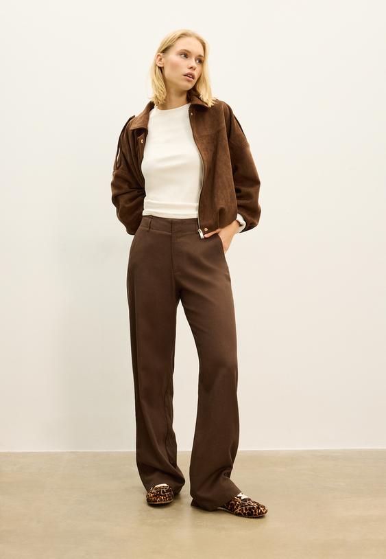 Een rechte broek van katoen vormt de basis van een moeiteloze dagelijkse look. Combineer met een basic T-shirt en een lange blazer voor een moderne office-casual vibe. Voeg sneakers of loafers toe voor comfort en stijl. Voor een nettere look draag je een blouse of een fijn gebreide top met een leren of suède jasje. Accessoires zoals een minimalistische tas en simpele sieraden voltooien de outfit zonder te overheersen.