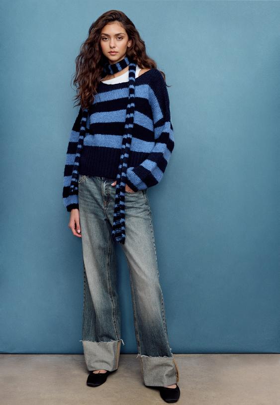 Stradivarius Pulover Tricotat Cu Guler Bărcuță, Dungi Și Fular Bleumarin M